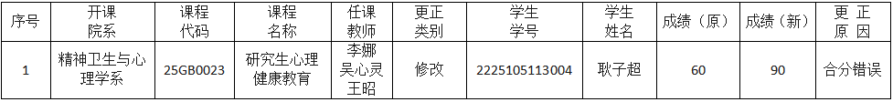 根据《大连医科大学研究生课程教学管理及成绩考核管理规定(试行)》规定,依研究生本人申请,经学院及开课院系对2025-2026学年秋季学期课程有关成绩复查,现就2025级1名硕士研究生课程成绩更正情况公示如下: