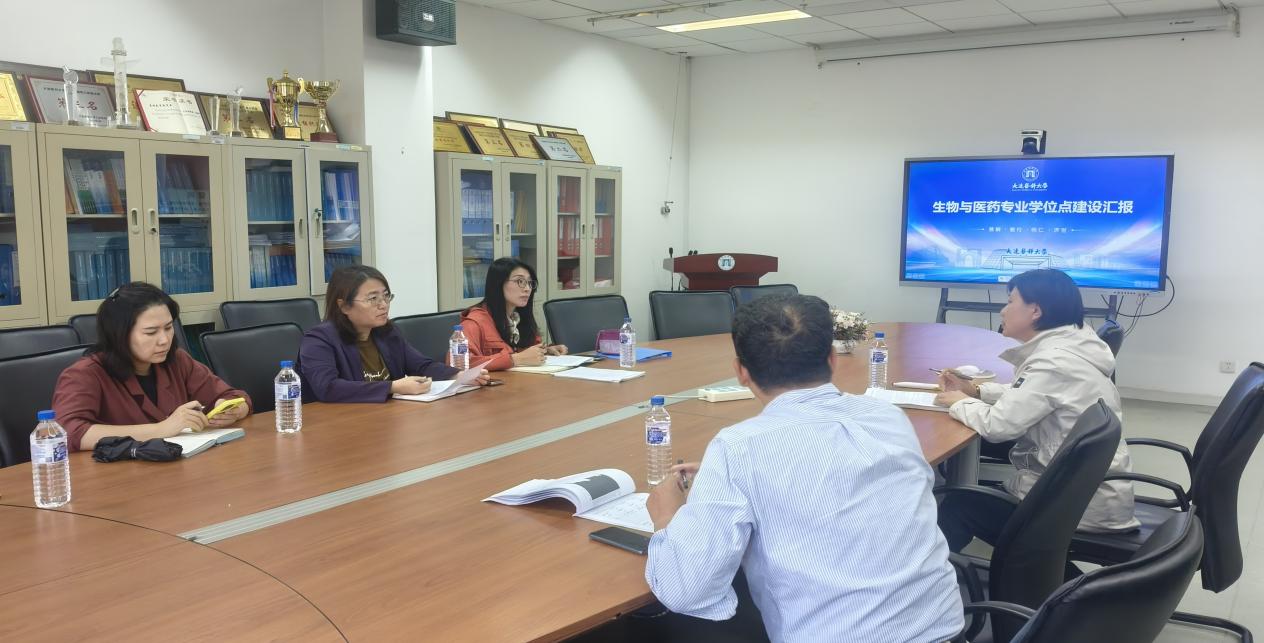 基础医学院副院长侯洁、生物制药教研室主任冯斌就生物与医药专业学位类别申报及建设情况进行汇报。双方以该专业学位类别授权审核为依据,重点分析学科特色、师资队伍结构、实践教学条件等核心内容及待改进方向。