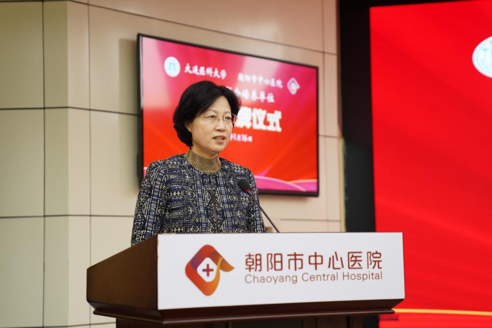 刘莹代表大连医科大学致辞,对朝阳市中心医院近年来的发展给予高度评价。她表示,此次共建研究生联合培养单位是深化医教协同、服务“健康辽宁”战略的重要实践。学校将充分发挥在学科建设、师资队伍、科研平台等方面的优势,积极推动优质教育资源与朝阳市中心医院丰富临床资源深度融合,共同推动医教研协同和医学人才的培养,为辽西地区医疗卫生事业发展注入新动能,开启院校合作的新篇章。